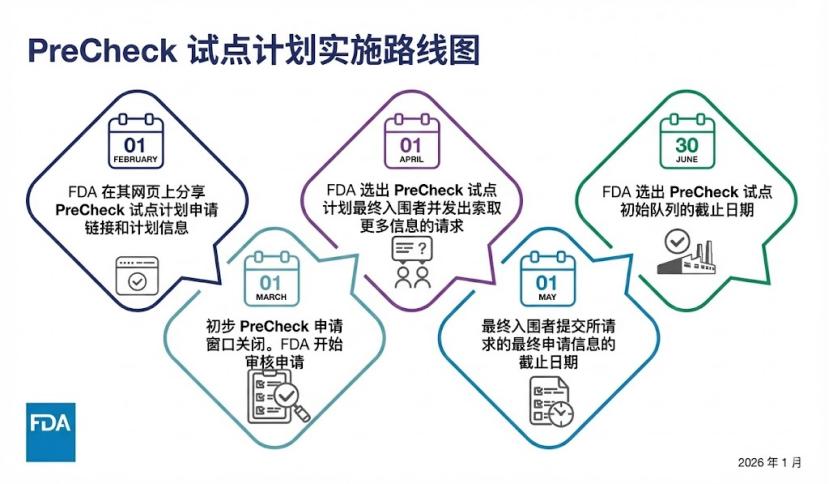 FDA于1月21日发布实施路线图,确认将于2026年2月1日开始接受“预先确认”试点计划(PreCheck Pilot Program)的申请。