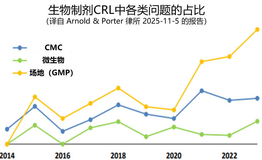 CRL是FDA发给注册申报企业的回复信,详尽列出不能批准其注册申报的理由,多数是因为研发和GMP做的不到位。下图显示生物制剂(包括各种单抗药品)近年来因场地问题——也就是GMP问题——收到CRL的占比越来越高。