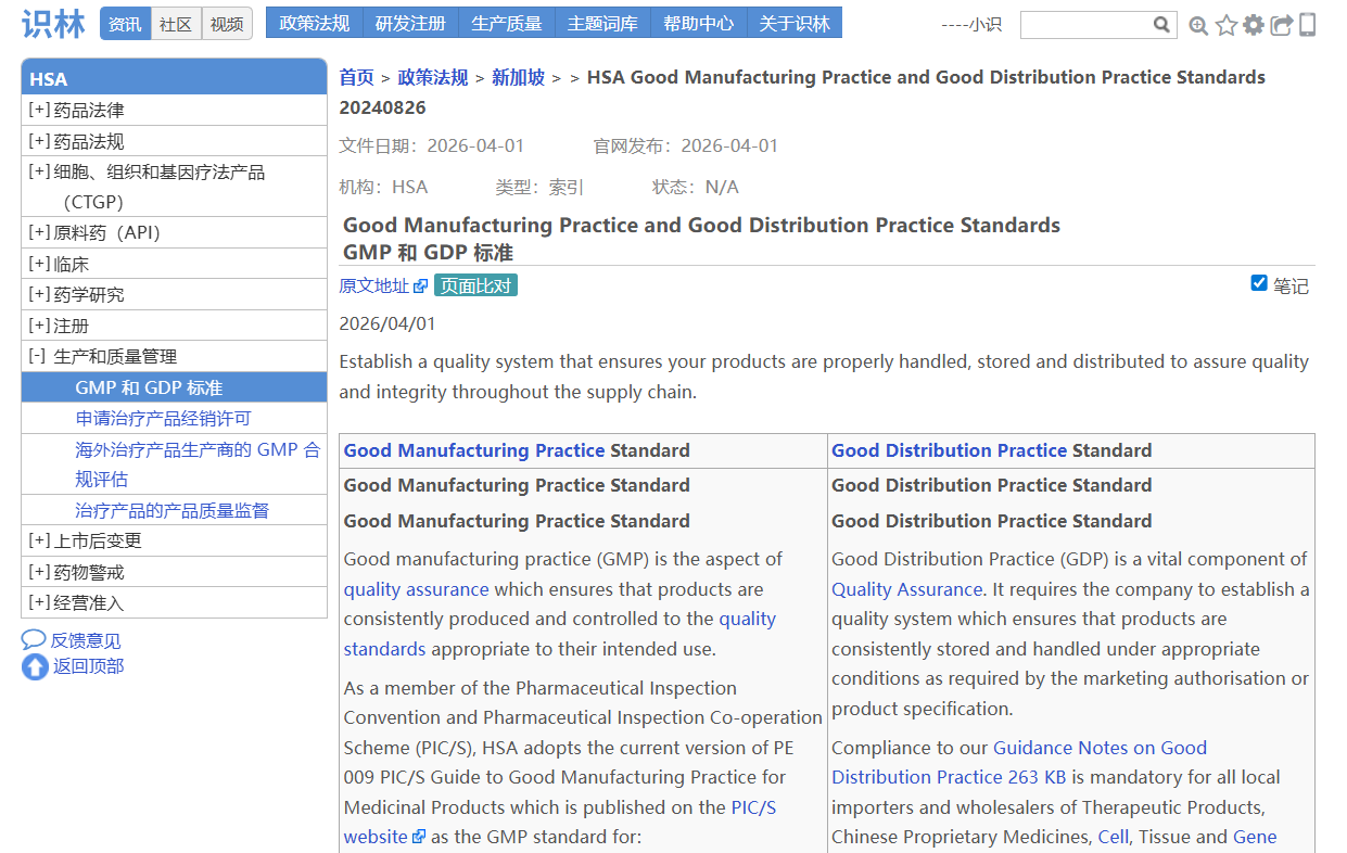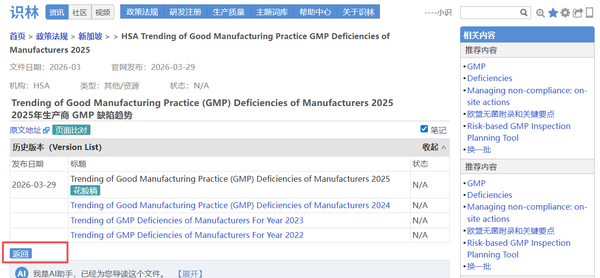 新加坡卫生科学局(HSA)作为PIC/S正式成员,其GMP 标准、GDP 要求、历年缺陷 趋势及配套指南是企业现场检查准备的参考依据之一。当用户找到《2025年生产商GMP缺陷趋势》 (例如从识林发布的专题文章《新加坡HSA总结2025年药品GMP检查缺陷》 找到),此时点击“返回”即可抵达HSA的“GMP和GDP标准 ”总览页面,回溯至HSA全部资源库,涵盖GMP(PIC/S PE 009-17及附录)、GDP、历年GMP/GDP缺陷趋势分析(2023-2025)、场地主文件编制指南、基于健康暴露限值的交叉污染 控制指南等关键文件。
