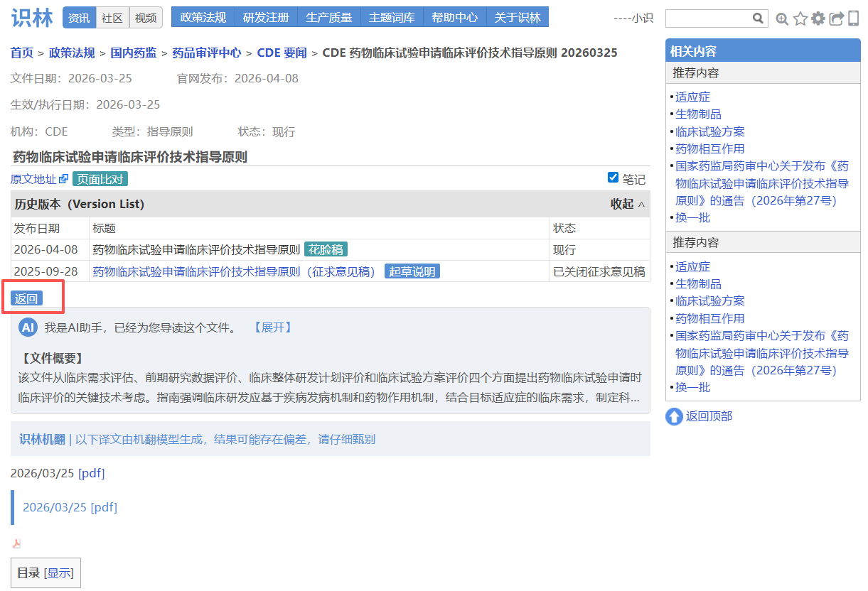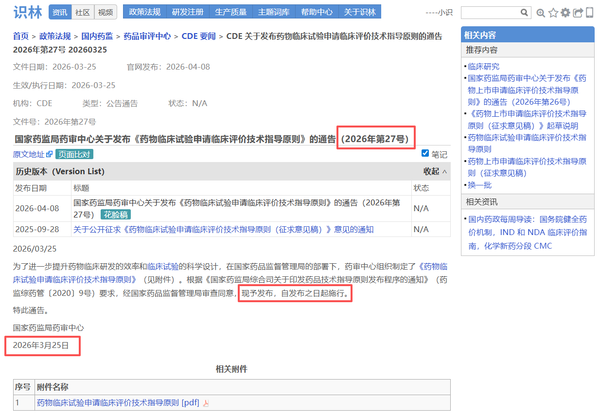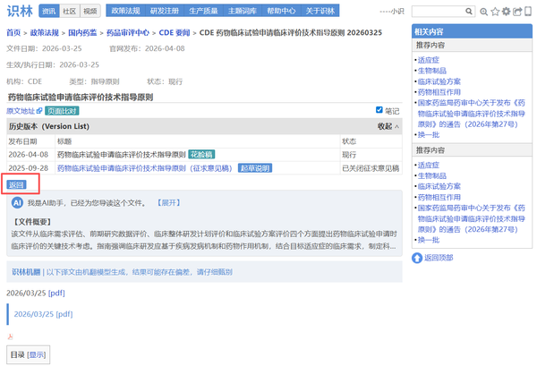 大家熟悉的CDE指导原则,其技术要求集中在指导原则正文,但官方发布背景、文件号、生效日期均在另一份通告中。例如从《药物临床试验申请临床评价技术指导原则》 正文点击“返回”即可直达通告页面 ,确认文件编号(2026年第27号)、发布日期和施行日期,并可下载原始PDF附件。对于需要确保申报合规的注册和临床研发人员,这一设计让技术内容与官方依据始终对应,避免因信息分离导致疏漏。另外,这也是考虑到用户们常用“27号文”来指代指导原则的实际场景。