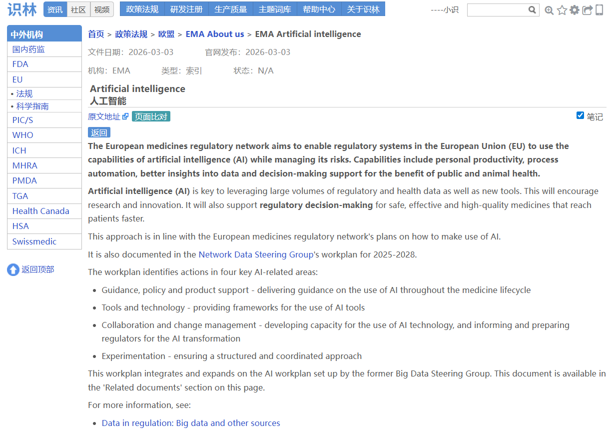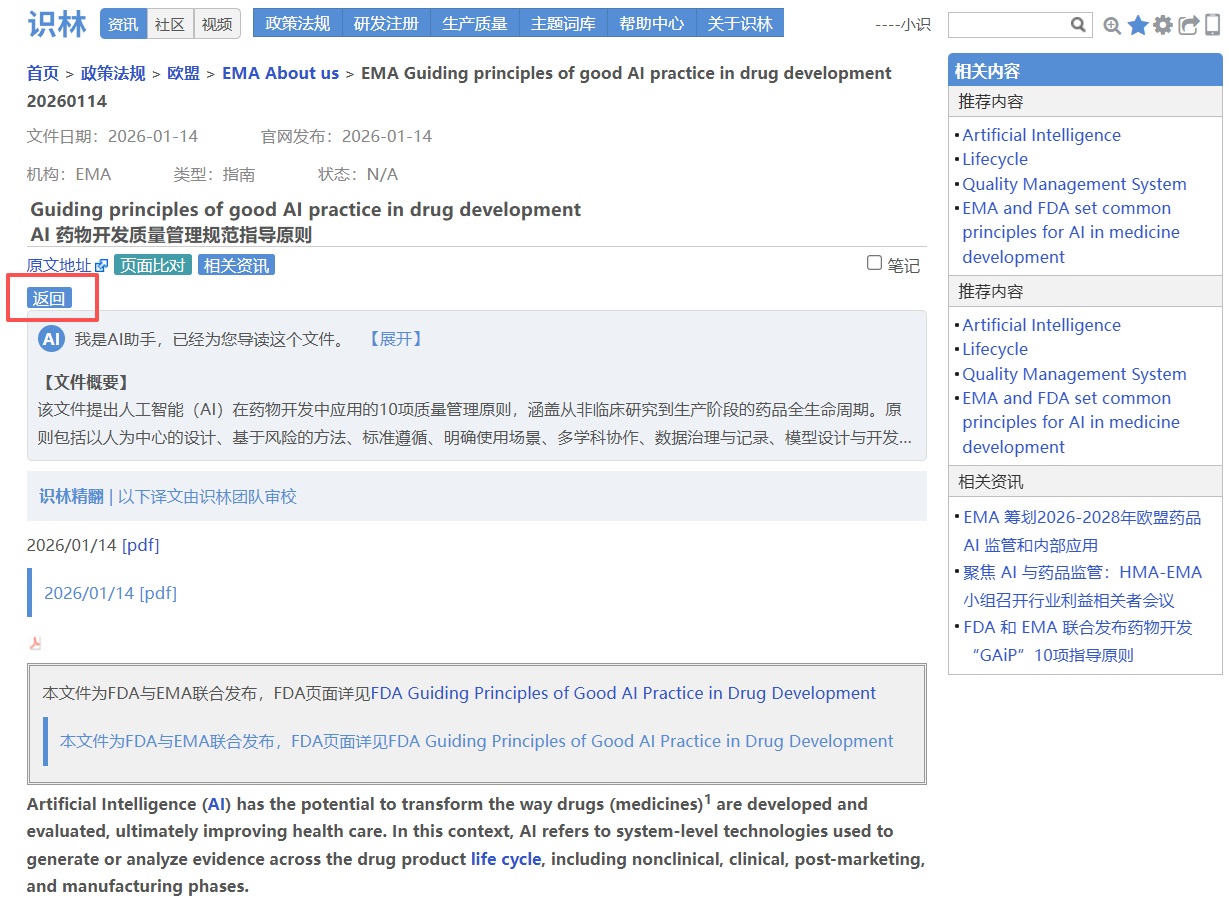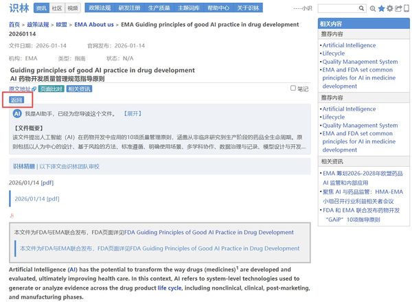 AI 在药物开发和监管中的应用日益增多,但相关指南分散在不同页面,官方来源也需要反复核对。识林将《AI药物开发质量管理规范指导原则》 与EMA人工智能总索引页 通过“返回”键关联,从一份文件即可回溯至EMA全部AI资源库(思考性文件、AI观察站报告、Scientific Explorer工具及首个AI临床工具资质 认证案例),并可通过“原文地址”进一步溯源至EMA官网原始发布页面,可供快速定位、交叉核对,确保每一份文件都有据可查。