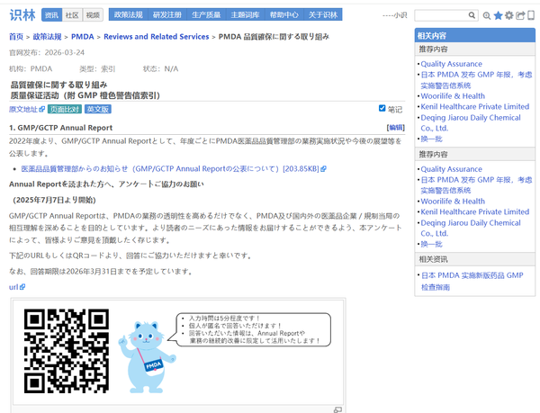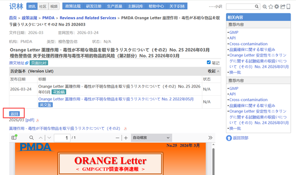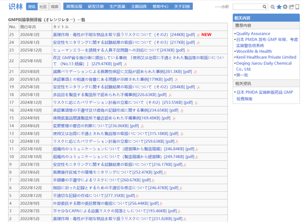 日本药品和医疗器械管理局(PMDA)“橙色警告信”是PMDA分享的GMP检查缺陷典型案例。识林将单份警告信 与《品質確保に関する取り組み》 页面通过“返回”键关联,从一份案例即可回溯至全部橙色警告信列表、GMP/GCTP年度报告等资源。PMDA发布的GMP/GCTP年度报告详细介绍了其在药品质量管理方面的业务实施与未来展望;另外,页面列出的GMP橙色警告信索引涵盖稳定性 试验结果处理、无菌 性保证缺陷等具体问题案例,为行业提供了实用参考。