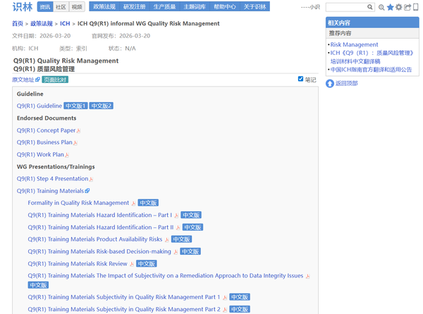 ICH 《Q9(R1)质量风险管理》指南 配套的培训材料、概念性文件等分散在不同页面,且多为英文原文。当您找到Q9页面,点击“返回”即可打开完整索引 ,查看完整文件清单,包括CDE 和CFDI 的两份中文翻译版,以及最近更新的培训资料包。ICH 的官方PPT完整细致,具有相当的学习参考价值。