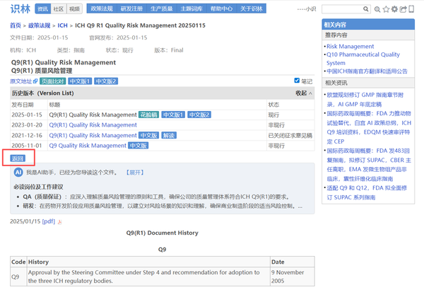 场景3:从ICH Q9【返回】 查阅历史版本,中文版以及最新培训资料包