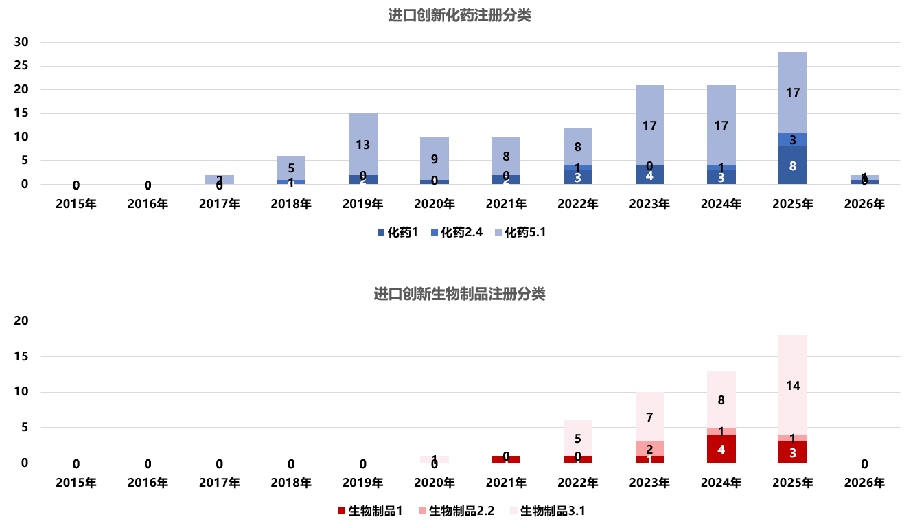 中美两国在药品注册 分类和监管体系上存在差异。FDA通常将在美国首次批准的新分子实体 视作“创新药”统计。而中国在2016年监管改革后建立了新的药物注册分类 ,强调对“全球首创新药”与“已在境外上市的进口新药”进行区分。创新化药和创新生物制品的注册分类均为1,而境外已上市化学药和境外已上市生物制品 分别对应 5.1 类和3.1类。对进口创新药的特殊管理,在制度设计上以缩短创新药中国上市滞后为核心目标,通过明确境外原研药的注册路径,鼓励全球创新药在研发和申报阶段即纳入中国,实现更高程度的同步上市。