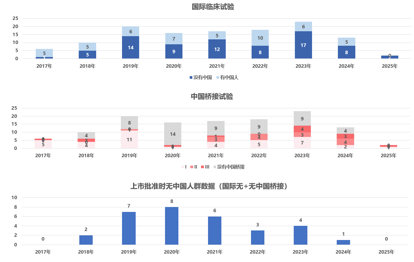 11. 这里的分析基于有CDE公开审评资料的进口创新药(不包含国产国产创新、国内仿制或改良产品),总数是125。国际临床试验:根据审评资料里有效性分析的临床试验,临床分期统计按照关键临床的最高分期进行统计;审评卷宗中未明确国际临床中是否包含中国人,则按照无中国人入组统计。国内桥接:根据审评资料里所有在国内开展的桥接临床试验(包括PK、安全性、有效性),临床分期按照所有临床试验中分期最高的统计。