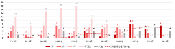图 2显示,中美创新药同步获批(批准时间相差在1年以内)的情况呈上升趋势。例如,2015 年美国批准的新药中仅有 1 个在一年内引入中国,而到 2023 年这一数字增至 8 个,反映出近年来中美创新药上市时间差整体有所缩小。2025 年,美国当年批准的新药截至 2026 年初已有 11 个获中国批准上市,其中 8 个为进口创新药(阿夫凯泰在中国的批准时间早于美国),另有 3 个为中国本土研发的新药。这一趋势并非单纯由审评时效变化所驱动,而是在监管环境持续优化的背景下,审评审批优化和企业全球同步研发与申报策略调整的综合结果,显示部分创新药正逐步实现中美市场的准同步进入。