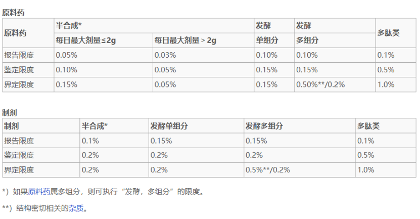 相比FDA,EMA指南通过分类预先划定限度,我国指南也沿用(如下图)。