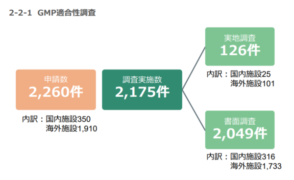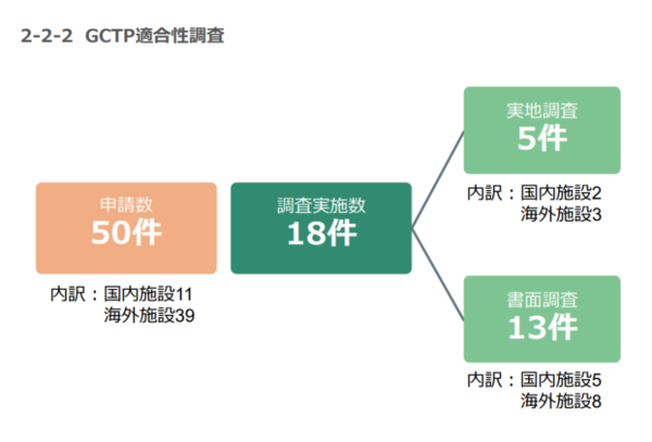 由上图可知,2024年,PMDA共收到2,260件需要GMP检查的申请,实际完成检查2,175件,大部分是通过书面完成的。在126件实地检查中,针对海外设施的检查远远超过国内设施。GCTP申请数量要少得多,且大多数申请并未实施检查。