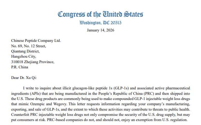 此次信函发往Chinese Peptide Company、Hubei JXBio Biotech以及Fujian Genohope Biotech。美国会新闻稿称此举源于日益增长的担忧,即中国生产的GLP-1产品及原料药正被用于制造药房配药版(compounded)注射型减肥药物,这些药物被虚假宣传为FDA批准的诸如Ozempic和Wegovy等药物的替代品。