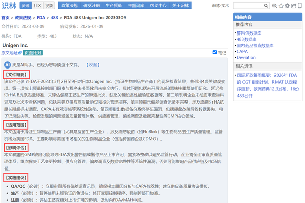 一个新的变化是,识林将会员们喜闻乐见的AI 导读引入了483和警告信,为大家先“读缺陷”,高效抓取关键信息。详见文末。