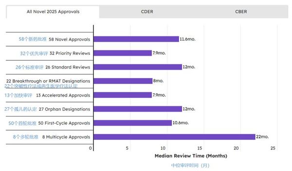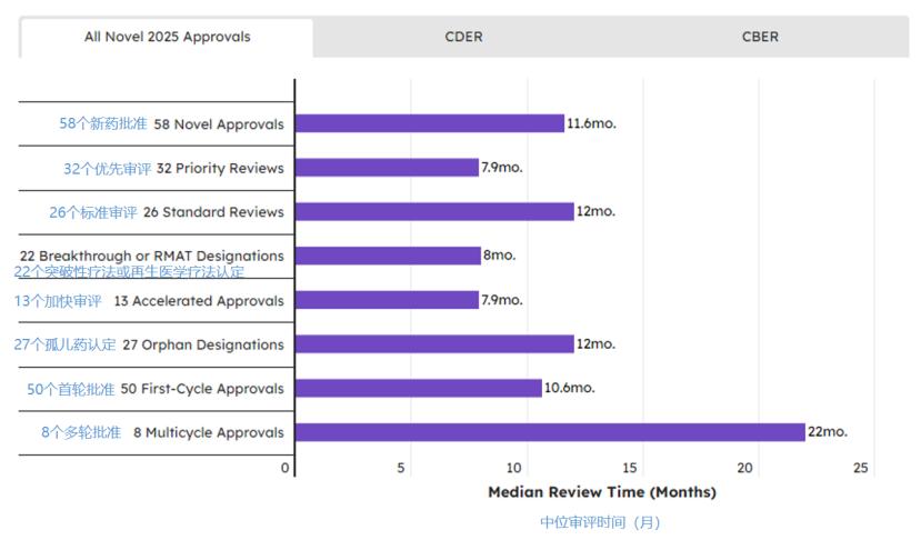 在2025年总计58项新药批准中,标准审评占26项(45%),其中CDER的46项批准中有21项为标准审评(46%),而CBER的12项批准中有5项标准审评(42%)。