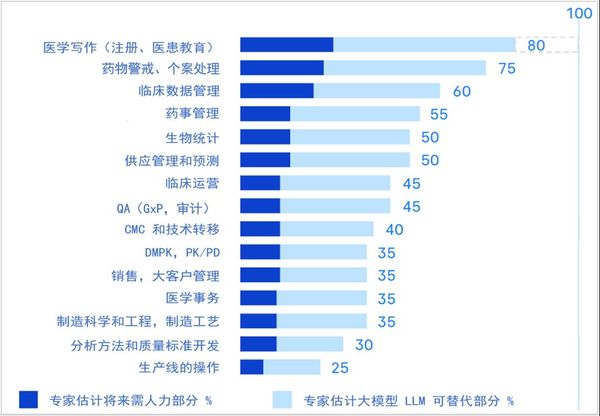 接着报告的是罗氏(Roche)全球制造执行副总Susanne Hundsbaek-Pedersen女士(她也是丹麦人),题目是“面对前所未有的机会和挑战,人人有责”。她报告中的图片(见下图翻译版),给出了药业各领域中AI未来可能代替人工的比例。