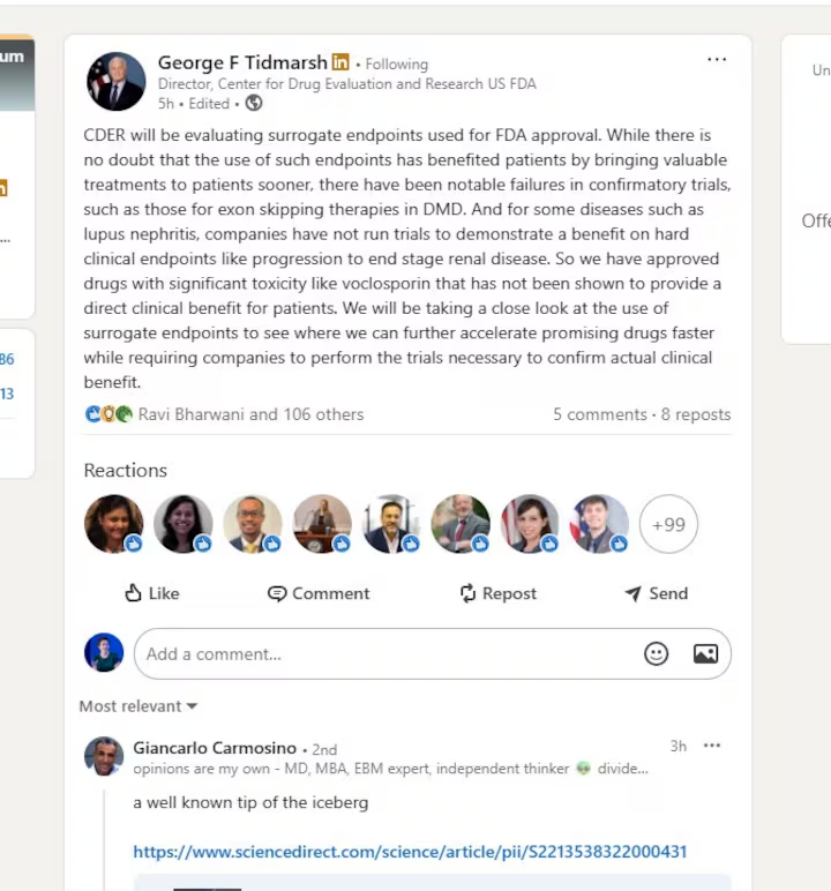 “CDER将评估用于FDA批准的替代终点。尽管使用这些替代终点无疑使患者受益,因为它们使有价值的治疗更快可及,但在确证性试验中也出现了一些显著的失败案例,例如杜氏肌营养不良症(DMD)中的外显子跳跃疗法。对于一些疾病,如狼疮性肾炎,公司尚未开展试验以证明在‘硬’临床终点(如进展至终末期肾病)方面的获益。因此,我们批准了一些具有显著毒性的药物,例如尚未被证明对患者提供直接临床益处的伏环孢素(voclosporin)。我们将仔细审视替代终点的使用,以确定我们可以在哪些方面进一步加速有前景药物的批准,同时要求公司开展必要的试验以确认实际的临床获益。”(CDER will be evaluating surrogate endpoints used for FDA approval. While there is no doubt that the use of such endpoints has benefited patients by bringing valuable treatments to patients sooner, there have been notable failures in confirmatory trials, such as those for exon skipping therapies in DMD. And for some diseases such as lupus nephritis, companies have not run trials to demonstrate a benefit on hard clinical endpoints like progression to end stage renal disease. So we have approved drugs with significant toxicity like voclosporin that has not been shown to provide a direct clinical benefit for patients. We will be taking a close look at the use of surrogate endpoints to see where we can further accelerate promising drugs faster while requiring companies to perform the trials necessary to confirm actual clinical benefit.)