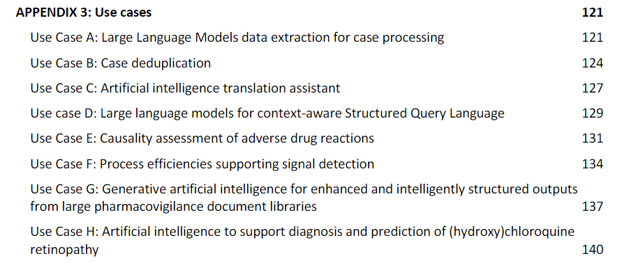 附件3列举了多达8个用例(见下图),如LLM数据提取用于案例处理、案例去重、AI翻译助手、LLM用于上下文感知的结构化查询语言(Structured Query Language,SQL)、药物不良反应 因果关系评估、支持信号检测的流程效率提升、从大型药物警戒文档库中生成增强和智能结构化的输出、支持诊断和预测(羟基)氯喹视网膜病变等,展示了AI在药物警戒中的多样化应用潜力,颇具参考价值。