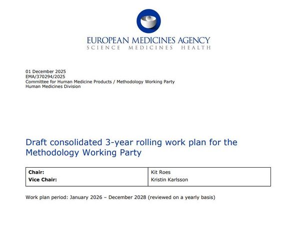 该草案概述了EMA方法学工作组(MWP)2026-2028年的战略规划,聚焦方法学创新与监管协同。内容分为战略目标、战术目标及操作目标三部分。战略层面提出七项核心任务,包括提供跨产品生命周期方法学支持、制定指南以优化药品审批、构建定量证据评估框架等。战术层面按学科分类详述工作计划:生物标志物领域将修订伴随诊断指南;生物统计学科需更新多重性试验、非劣效性设计等指南;临床药理重点完善寡核苷酸药物评估框架;数据科学与AI领域拟发布临床开发与药物警戒应用指南;建模与仿真(M&S)将扩展PBPK模型应用场景;真实世界证据(RWE)计划修订注册研究指南并开发缺失数据处理规范。文件还列出跨学科协作项目,如外部对照证据生成、合成数据使用等,并规划与FDA等国际机构合作统一AI监管原则。操作层面明确MWP将为科学建议工作组(SAWP)、儿科委员会(PDCO)等提供产品专项支持。附录包含28项缩写词表,涵盖ICH指南代码及欧盟专用术语。