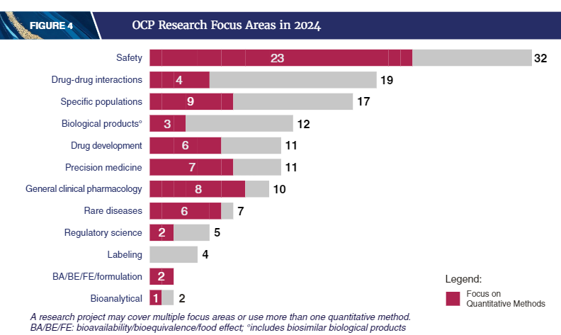 2024年,OCP支持FDA共发布了八份临床药理学指南,为药物相互作用、抗体偶联药物和寡核苷酸的临床药理学研究、生物等效性研究、肿瘤药物剂量优化、质量平衡以及肾功能受损的影响等主题提供了建议。监管科学研究方面,2024年OCP的研究组合包括103个项目,并在多个重点领域撰写发布了120篇学术出版物(报告中公布了标题和超链接)。
