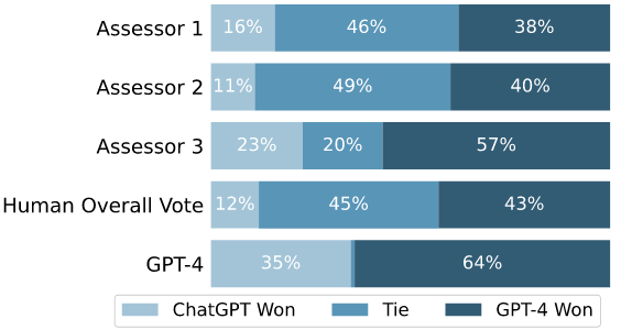 研究人员对过去五年中选出的100份公开可用的NDA审评文档进行了一系列广泛的评估,范围从自动化指标到FDA专业人员的评价,采用的LLM包括GPT-4(进行此项工作时ChatGPT的最新版本)。研究观察到,在整个迭代提示过程中,摘要的质量逐步提高。此外,根据FDA专业人员的评估,GPT-4的表现由于旧版本ChatGPT(43% vs. 12%,即GPT-4在43%的测试案例中被认为表现更好)。用GPT-4自身进行评估者,其表现也显著优于旧版本ChatGPT(64% vs. 35%)(图2)。重要的是,所有FDA专业人员一致认为,GPT-4生成的摘要中有85%在事实上与“黄金标准”(即药品标签 )一致。