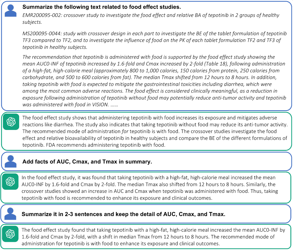 在该研究中,研究人员评估了ChatGPT从公开可用的NDA 审评文件中提供食物效应信息摘要的潜在应用,还通过将生成的结果与相应药品标签中的食物效应信息进行比较来验证 其性能。研究人员开发了一种直观的策略,称为迭代提示法,通过与聊天机器人进行交互式对话来执行此任务。具体来说,研究人员提出了一种三回合迭代提示法用于食物效应 摘要生成,其中在连续的对话回合中可通过提供关键词聚焦和长度控制的提示词来优化生成摘要的质量(图1)。