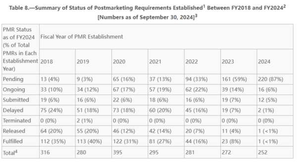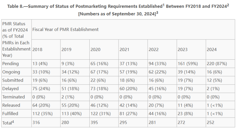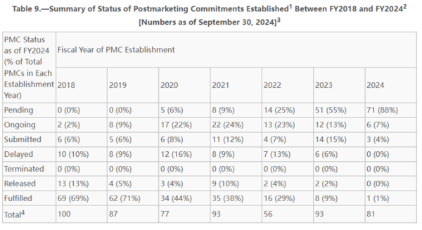 PMC方面呈现类似趋势。自2018财年以来,平均每年设立84项PMC。早期设立的PMC大多已履行或解除,例如2018财年设立的PMC中有69%(69/100)已履行,13%(13/100)已解除。2024财年设立的PMC中,95%(77/81)处于待启动或进行中状态。截至2024年9月30日,91%(136/149)的待启动PMC是在过去3年内设立的。自2018财年以来,平均9%(51/587)的PMC处于延迟状态。总体来看,企业履行自愿的PMC的情况还是优于FDA要求的PMR。