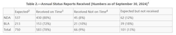 在2024财年,750份NDA和BLA的年度状态报告(Annual Status Report,ASR)到期应提交,包括537个NDA和213个BLA。ASR是申请人必须每年向FDA提交的关于每项临床安全性、临床疗效、临床药理学 和非临床毒理学 研究或临床试验的状态报告,无论是FDA要求的还是申请人承诺的。