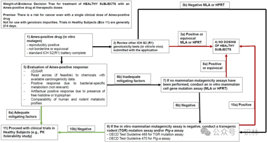 指南指出,“指南就 Ames 阳性药物活性成分的后续测试提出了建议,以应对申办人决定继续开发的罕见情况。这些建议旨在在健康人类受试者 中进行 FIH 试验之前解决和降低某些安全问题。”