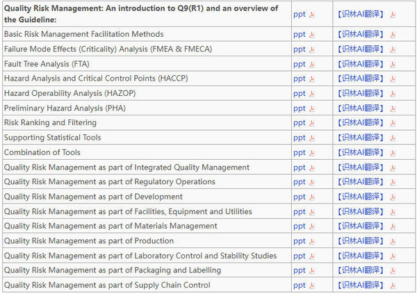 9个方法与工具涵盖Q9(R1)附录1:全面更新了失效模式与影响分析(FMEA )、故障树分析(FTA )、危害源与可操作性分析(HAZOP)等经典风险评估工具在现代化药政环境下的应用逻辑。
