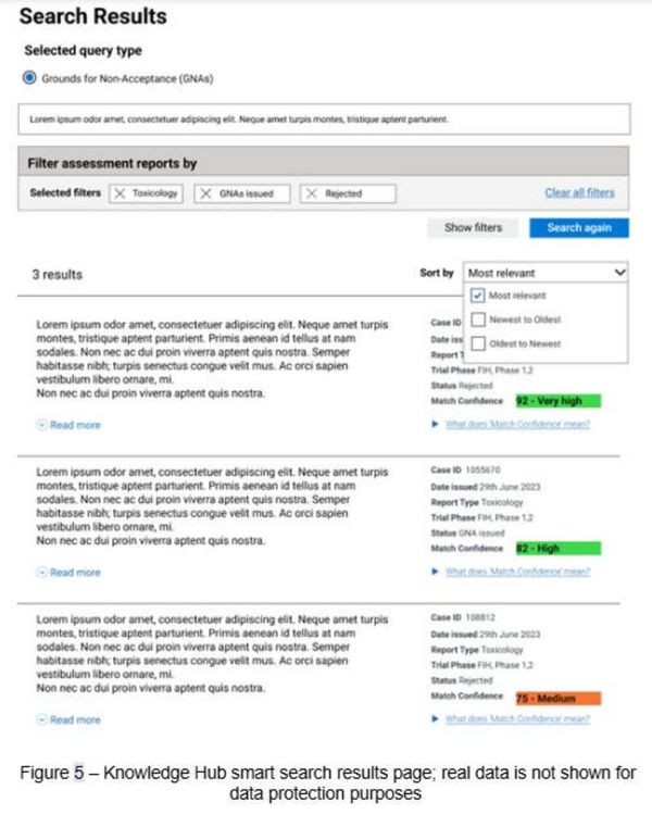 其中一个AI工具名为知识中心(Knowledge Hub),是通过自然语言处理技术,将历史申请中的常见问题进行分类和检索。该工具利用主题建模技术(Topic Modelling),将大量历史申请中的常见问题(Grounds for Non-Acceptance, GNA)进行聚类分析,构建知识库,为审评人员提供可阅读且可操作的历史背景信息。通过这种方式,知识中心能够帮助审评人员更高效地识别和解决类似问题,从而提高监管决策的质量和一致性。此外,该工具还通过直观的用户界面,提供了一个全新的途径来访问和理解历史信息,进一步优化了审评流程。