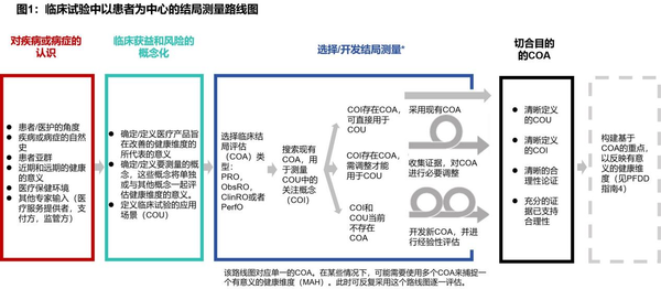 指南提出了一个名为“临床试验中以患者为中心的结局测量路线图”的通用流程,以指导申办者 选择、修改或开发 COA。该路线图强调了在选择COA时需要考虑的关键因素,包括被测量的概念(即COI)、COU以及COA的类型。