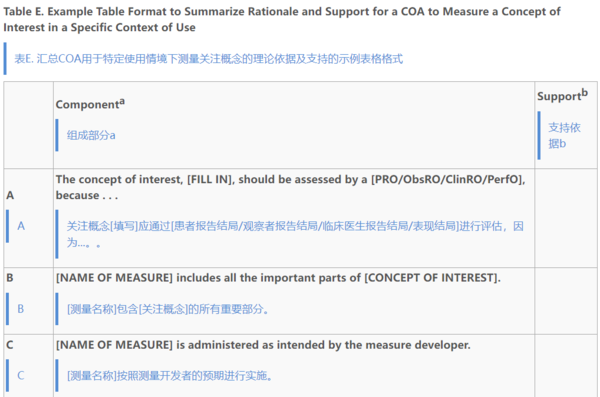 为方便申办者实际应用COA,也便于审评人员高效获取信息,附录E提供了一个表格模板,用于总结支持COA 的理由和依据。